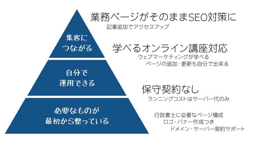 行政書士業務を行うために必要な機能を標準で備えた、行政書士専門のホームページテンプレートです。ホームページの「立ち上げ」に必要な作業は、こちらで対応いたします。