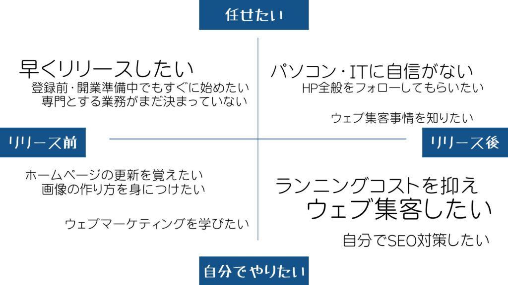 - 原則的に当方が作成いたしますが、今後のホームぺージ運用を考え、お客様が作成し当方がサポートする形もお選びいただけます。